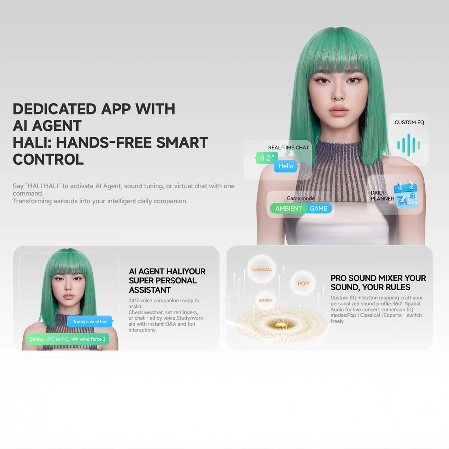 Meet HALI, your personal AI assistant that transforms these earbuds into your daily companion. Customize your EQ settings, access real-time translations, and seamlessly integrate with your smart home—all through intuitive app control.